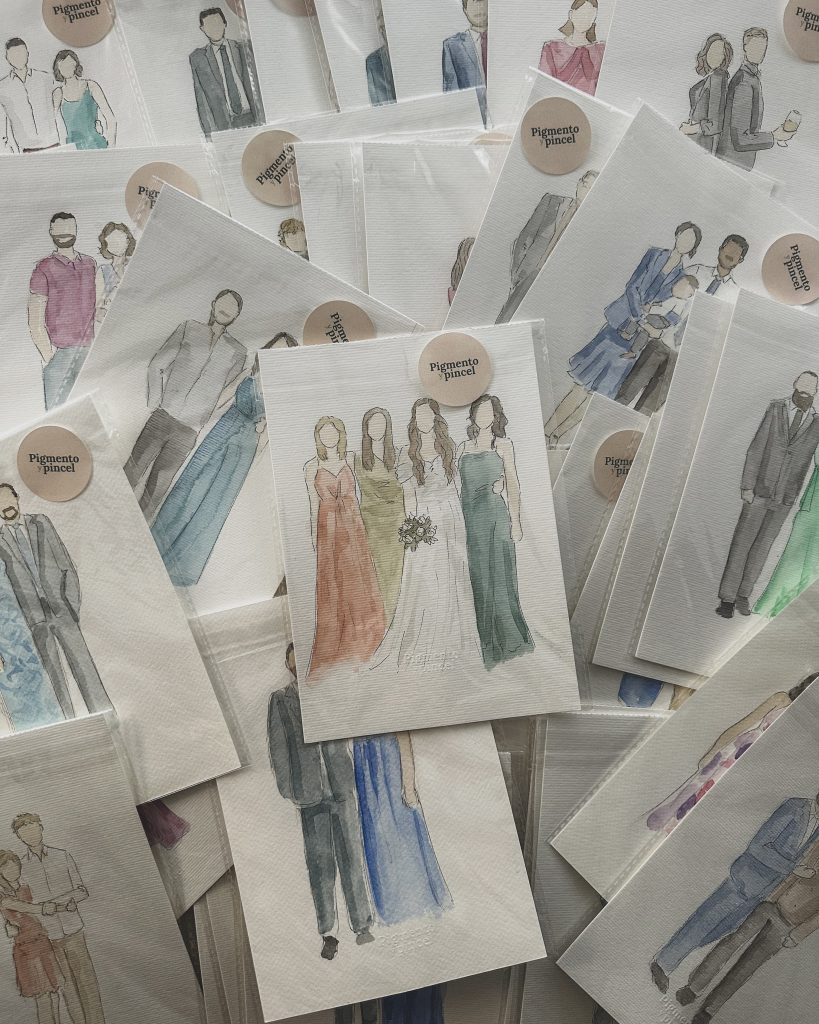 Los invitados se acercan, les hacemos una foto y continúan disfrutando del evento mientras transformamos ese instante en una acuarela única.